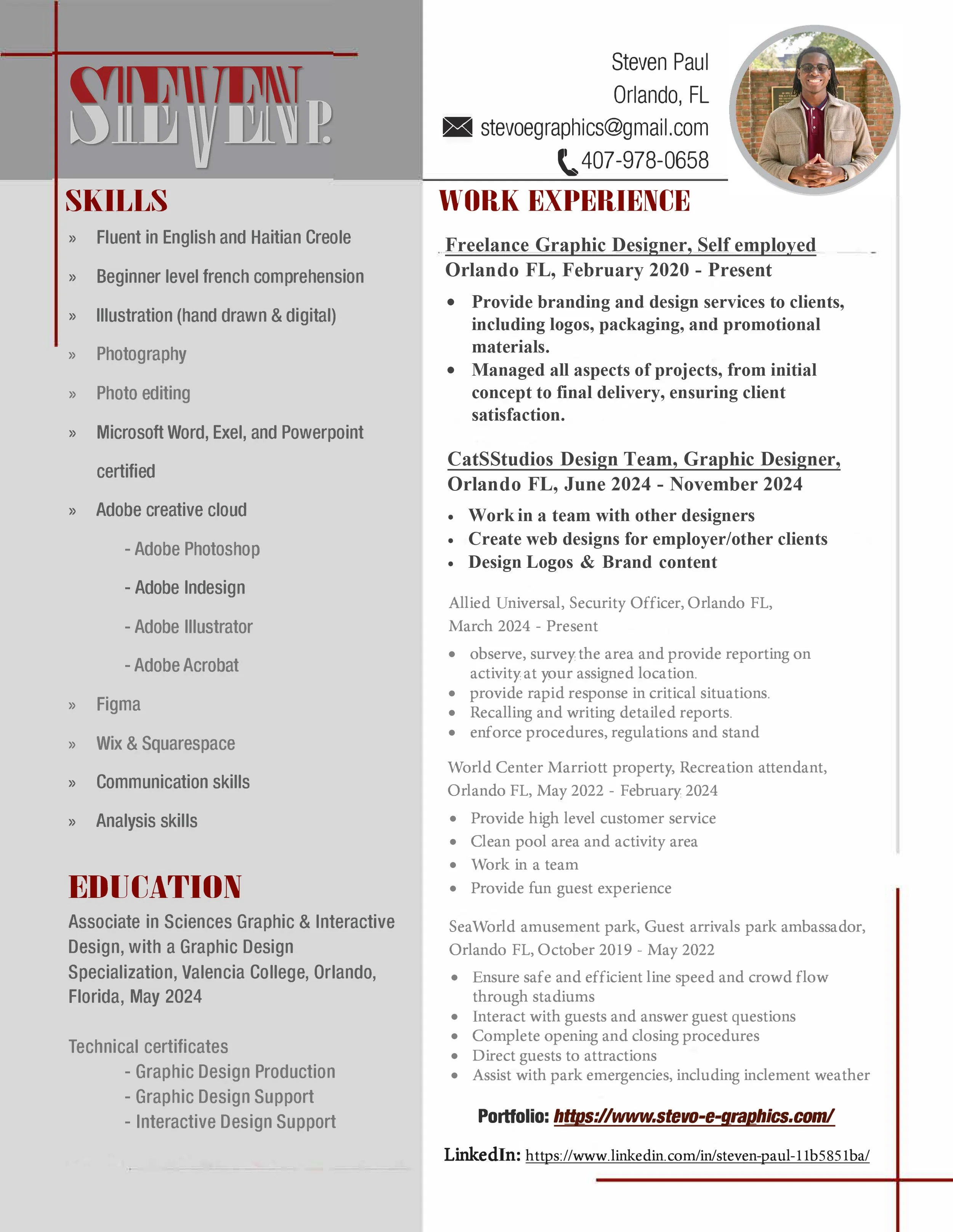 Welcome to my portfolio. My name is Steven P. Paul and I’m a young, graphic designer and illustrator. I am based in Orlando FL, and I have an A.S degree in graphic and interactive design from Valencia College. I currently hold 3 certifications (Interactive design support, Graphic design support, Graphic design production) and I work as a freelance graphic designer having made several projects for several clients. In my portfolio I showcase my best work, aiming to impress future employers and clients with my modern style and artistic designs.